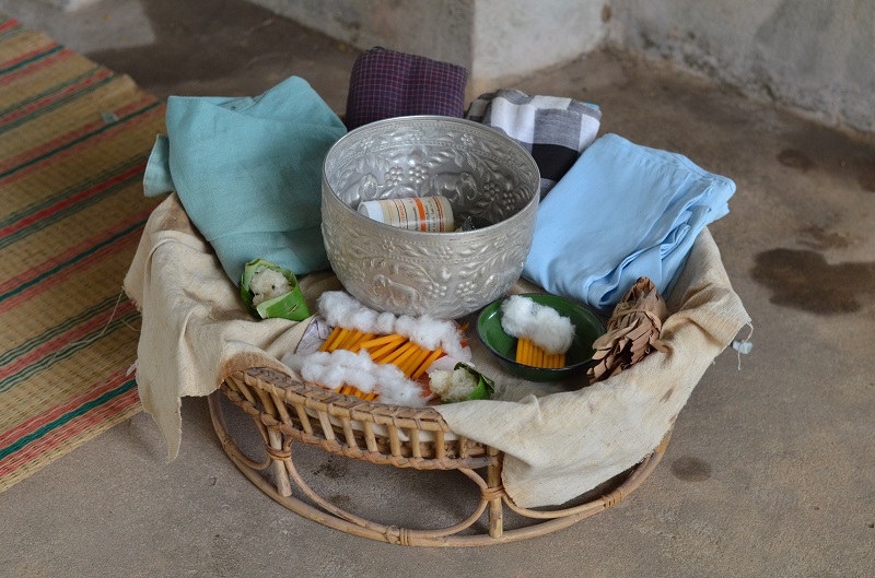 พอรุ่งเช้าเวลาประมาณ 7 นาฬิกา ชาวบ้านในหมู่บ้านจะช่วยกันเตรียมกรวยดอกไม้ และข้าวของที่จะนำไปถวายแก่หอเจ้าบ้านทั้ง 4 หอ ที่บริเวณบ้านเจ้าเสื้อซึ่งเป็นเชื้อสายชนชั้นผู้ปกครองของชาวไทดำ โดยจะมี “นายแต่ง” เป็นผู้นำในการจัดเตรียม ประกอบไปด้วยปานหวาย (พาชนะที่เป็นหวาย) หรือพานจำนวน 4 พาน ได้แก่
