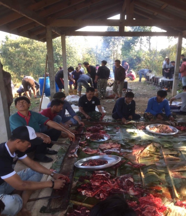 ส่วนของเลี้ยงในพิธี เพื่อบอกกล่าวแก่ผีละมาง ได้แก่ สันในกับซี่โครงเอามาแขวนที่เรือน พร้อมเนื้อใส่ถุง