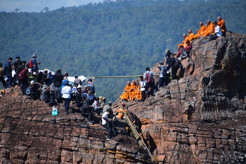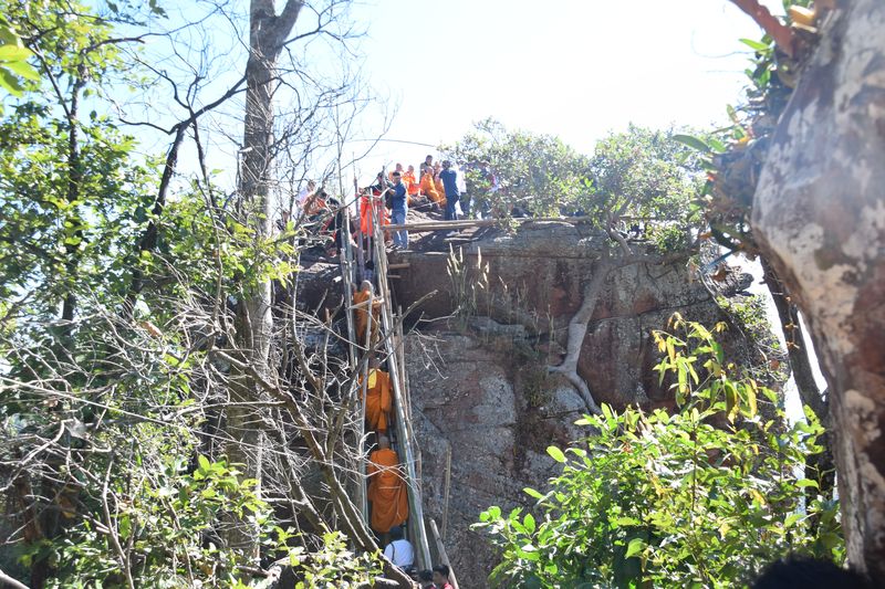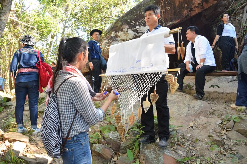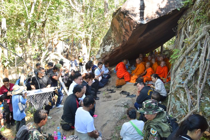 ในการเดินทาง พระสงฆ์และชาวบ้านจะเดินทางถึงยอดเขาอย่างช้าประมาณ 5 โมงเช้า เพราะพระสงฆ์จะต้องฉันเพลที่ถ้ำฉันเพล พอพระสงฆ์ฉันเพลเรียบร้อยแล้ว ชาวบ้านจะรับประทานอาหารร่วมกัน หลังจากนั้นพระสงฆ์และชาวบ้านจะนำธงของวัดเหนือปีนขึ้นบันไดไม้ไผ่ไปปักธงที่ยอดเขาฉันเพลเป็นแห่งแรก ในขณะที่กำลังปักธง ผู้นำชาวบ้านจะกล่าวคำอาราธนา พระสงฆ์ก็จะสวดชัยมงคลคาถา และในระหว่างนั้นผู้นำชาวบ้านจะนำธงไปผูกกับลำไม้ไผ่ จากนั้นก็นำลำไม้ไผ่นั้นไปปักไว้ในหลุมบนยอดเขา ซึ่งมีลักษณะเป็นร่องลึกสามารถเสียบด้ามธงได้ พร้อมกับกล่าวคำไชโยโห่ร้องกัน และชาวบ้านก็จะนำก้อนหินไปทับเพื่อให้เสามีความมั่นคงขึ้น ถือว่าเป็นอันเสร็จพิธี
