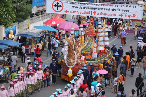 As the monks have been confined to their monasteries for three months, the end of Lent is also the time to give them generous offerings. “Tak Bat Devo” is a ceremony practiced in the central Thailand, while in the South the people organize the Chak Phra Festival to be assured the rain pouring seasonally. Also, the belief in Naga as mythical figure which offers water may give influence to the tradition. It explains why tugboats or land sleigh-like floats for pulling Buddha image are colorfully decorated with huge Naga figures, or possibly carved the alter in the form of Naga figures to bearing Buddha images. The folks call it “Nom” or “Phanom Phra”.